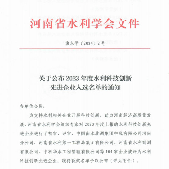 洛陽(yáng)水利工程局有限公司榮獲河南省2023年度水利科技創(chuàng)新先進(jìn)企業(yè)稱(chēng)號(hào)